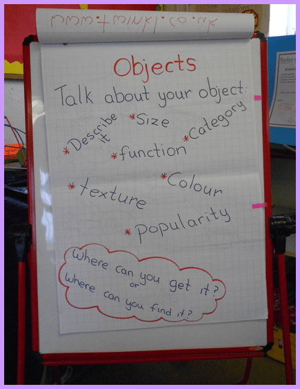 Example B:Use a flipchart to display a visual prompt for during ‘object discussion’ activities to ensure pupils include various types of descriptions e.g. size, function, category, texture, colour, popularity, where it can be found etc. These pointers can be very helpful to pupils who can find it very difficult to give full descriptions.