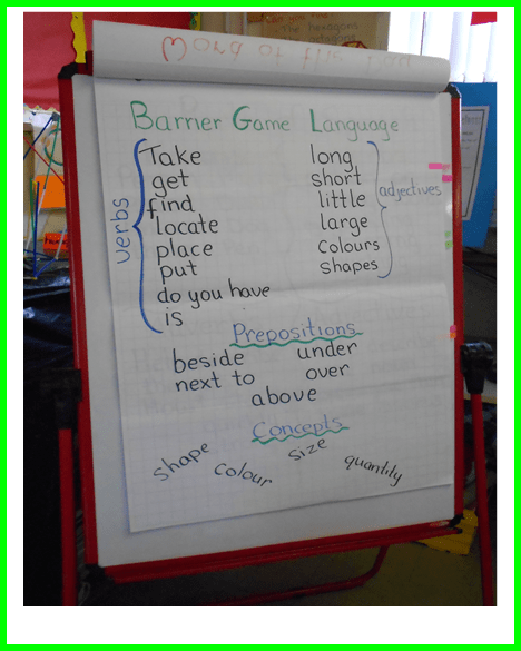 Example E: When doing barrier game activities the flip chart can be useful to discuss and record Barrier Games Language such as verbs, adjectives, prepositions and concepts.