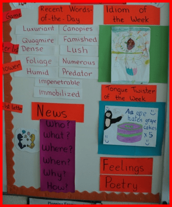 2. Recent words-of-the-day display: When covering a topic area such as ‘the jungle’, display the new word each day, perhaps in your language corner, so by the end of the three weeks all words are displayed ready to be used for oral discussion/ creating a story about ‘the jungle’. They can also be revised each day easily to ensure pupils remember them and retain them to long term memory.