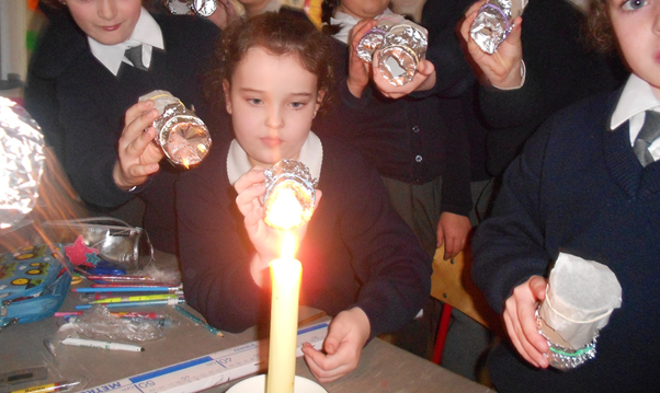 They created a tiny pin hole in their tinfoil. We darkened the room and used a candle as our light. The light of the candle entered the pin hole and the image could be seen on the grease proof paper. However…the image was upside down. (The image was also reversed but we could need coloured lights to prove that!)