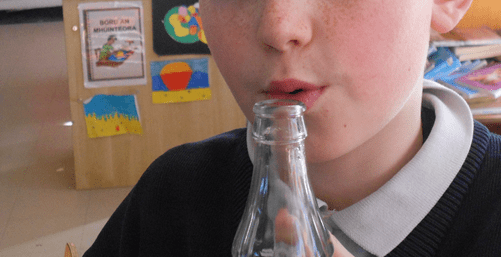 Pupils experimented with the sound that bottles make when filled with different levels of water. The bottles with a small amount of water made a deep sound and the bottles with a lot of water made high pitched sounds. Pupils went into groups with bottles of different pitches to create a song.