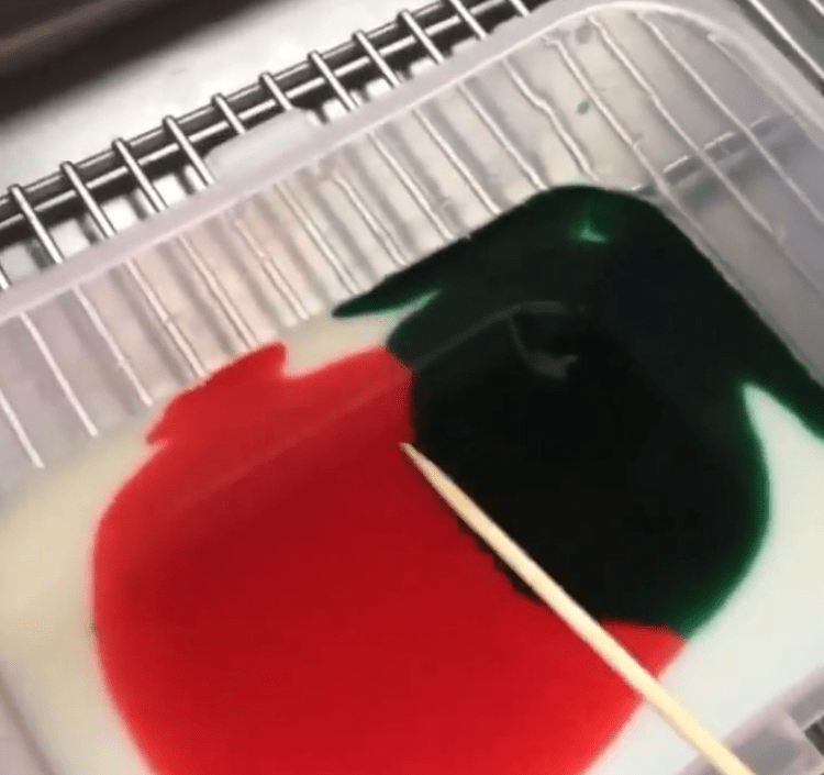 The food colouring in this experiment shows what happens when you mix fat loving substances ( milk) and water loving (washing liquid/ soap) substances.