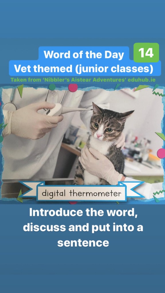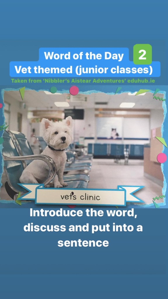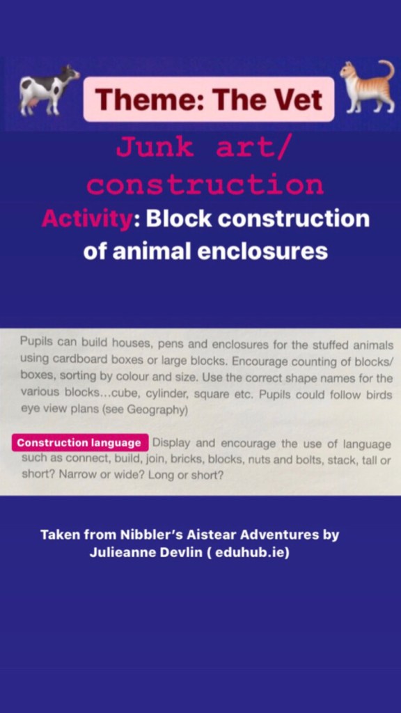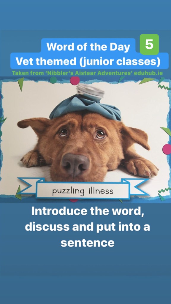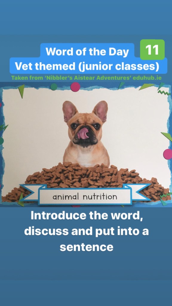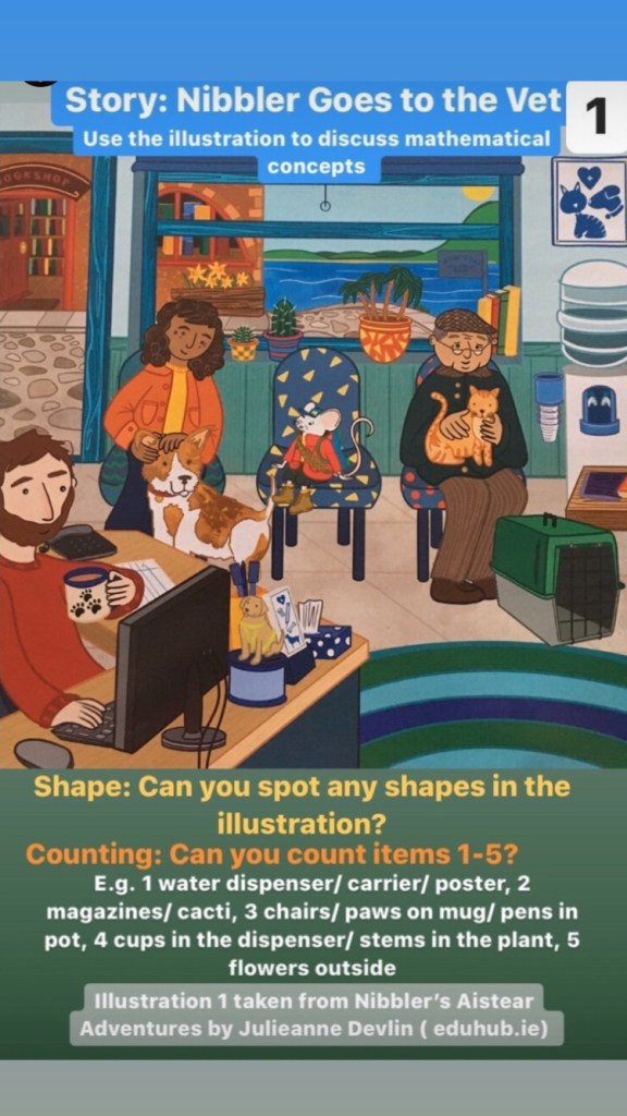 To aid with current distance learning, which unfortunately will still be in place for another while, I have posted some ideas from my resource Nibbler’s Aistear Adventures (www.eduhub.ie or http://www.cleverkids.ie) which might be useful for parents and teachers during remote teaching. There is enough content here to cover you for a few weeks with a new word of the day each day, learning through play activity and illustrations to encourage maths discussion.