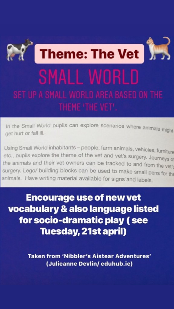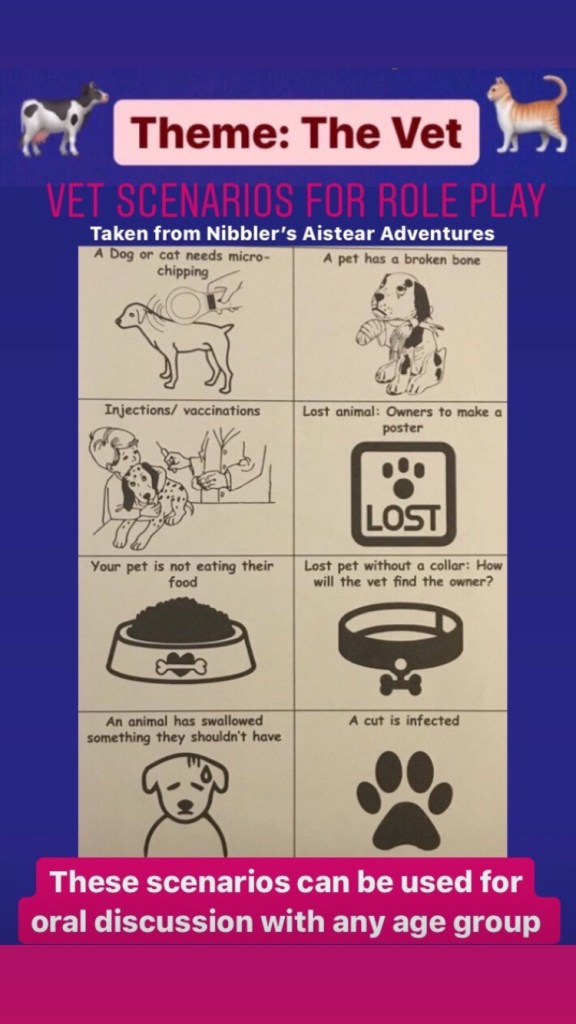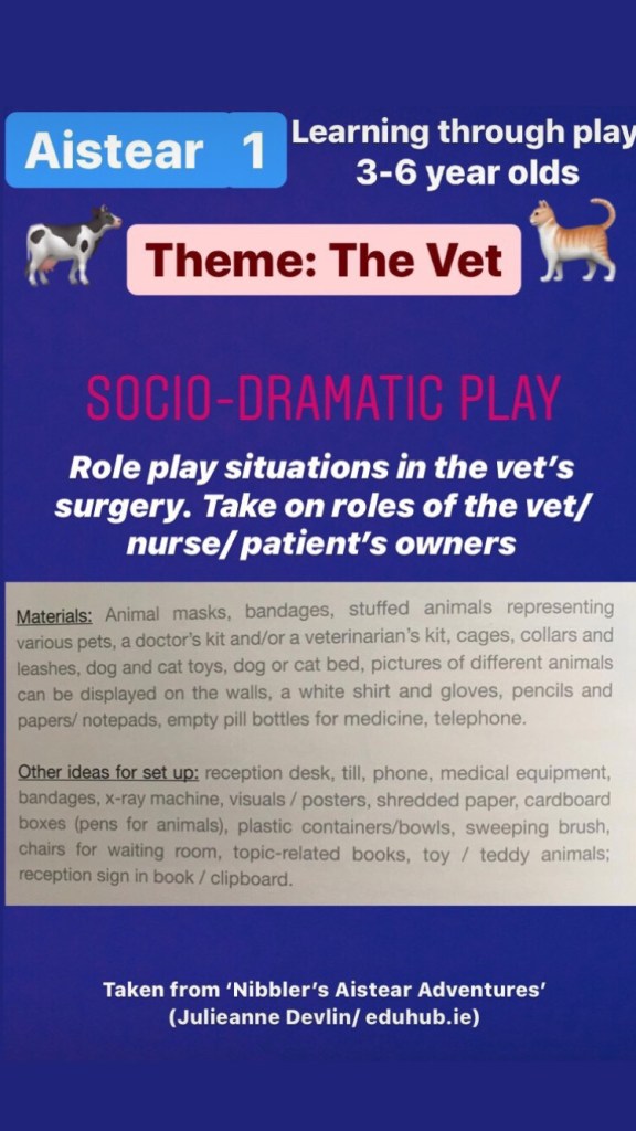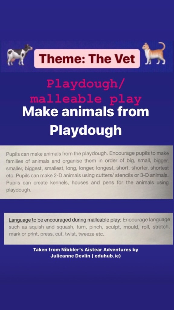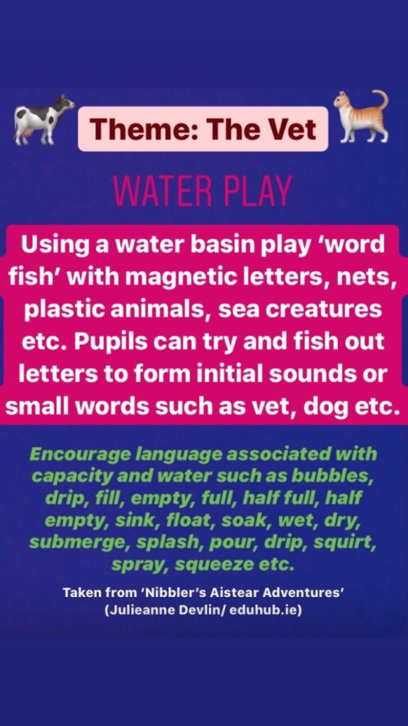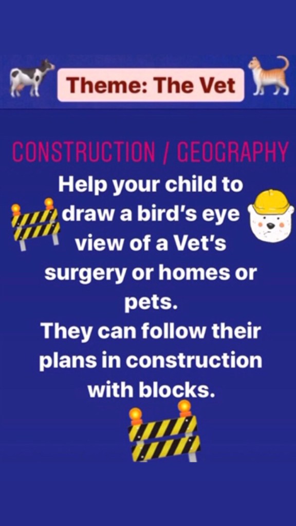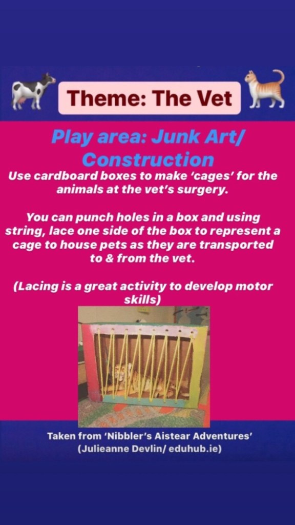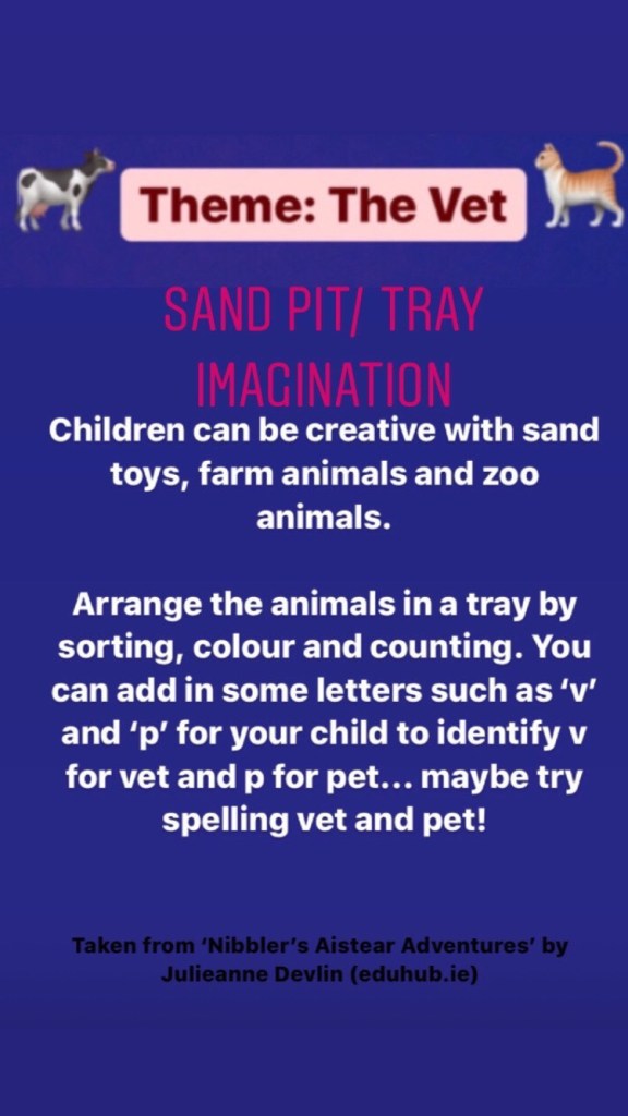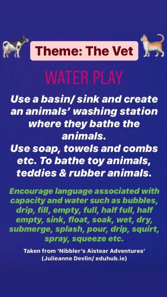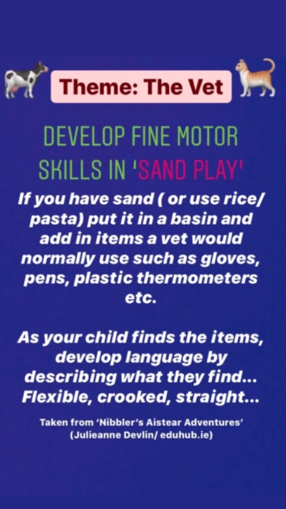 I’ve used the theme of the vet as it can also be integrated into spring. In the 23 suggested play activities below I’ve tried to include the different play stations, ones that parents should be able to adapt at home. I’ve included some images of Words of the Day should teachers wish to give a new word everyday to link with the vet theme.