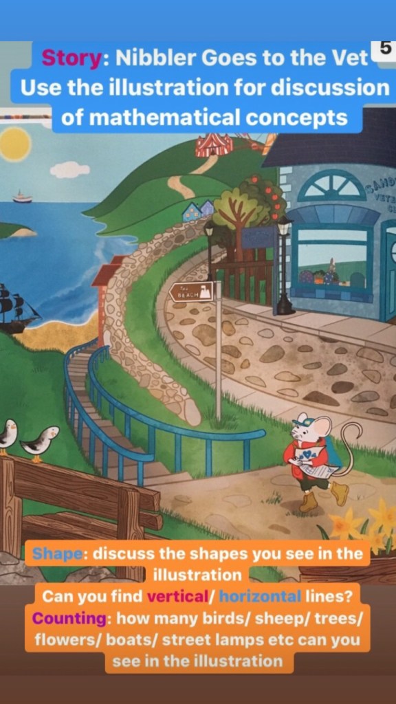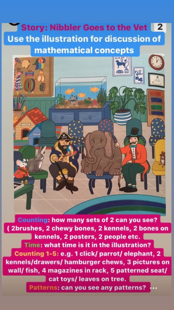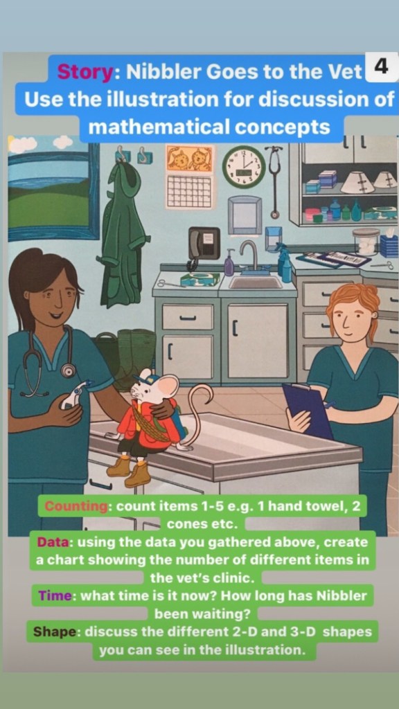 The illustrations below have been taken from my book ‘Nibbler Goes to the Vet’ and can be used to engage children in maths with counting, shape, measure, pattern etc. Children often find this approach to maths engaging and friendly and thus more receptive to learning maths.
