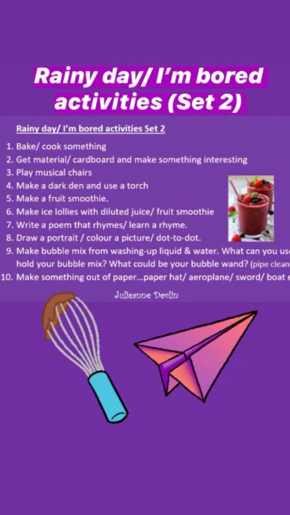 ‘I’m bored’ / Rainy day suggestions for this week. There is something there for all ages!