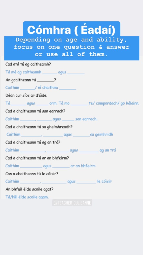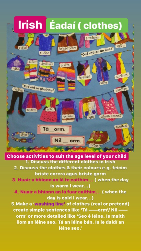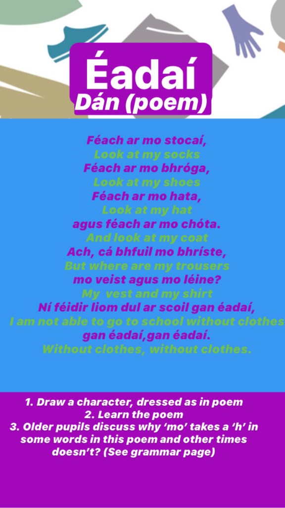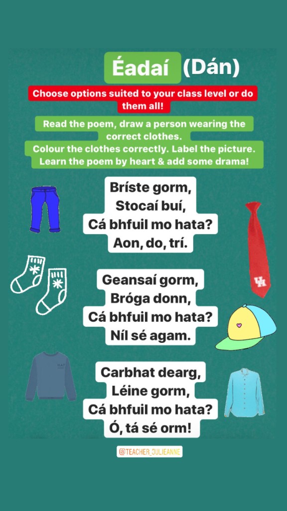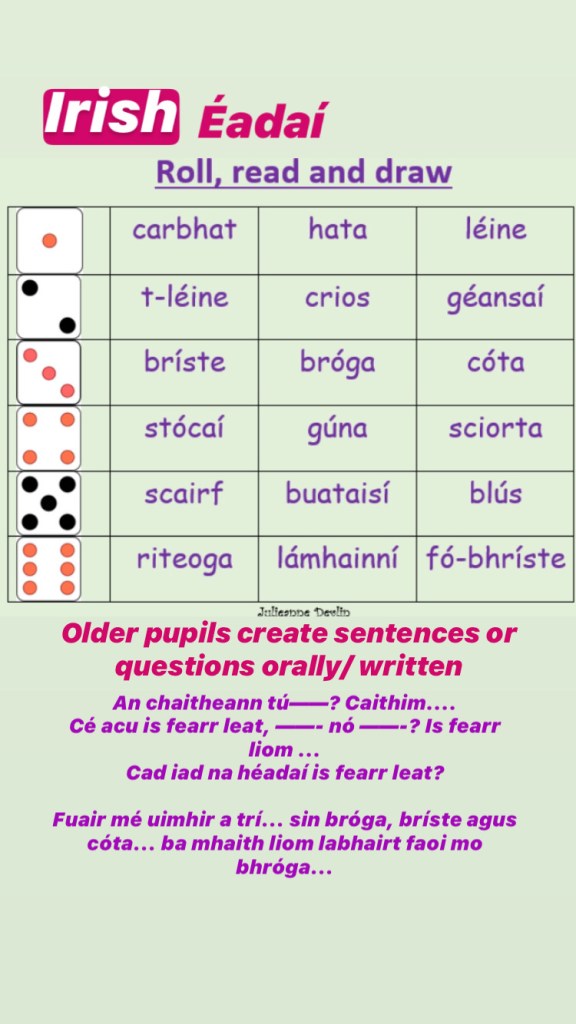For more ‘éadaí’ activities see ‘RTE School Hub’ this morning. Here is today’s activity for Fun Friday in Irish…’Roll, read and draw!’ I have some of the ‘éadaí’ activities we covered earlier this week below also.
