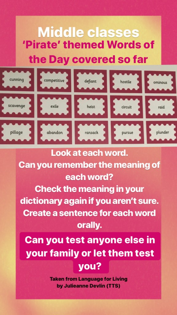 Middle classes: This week we will revise all the ‘Pirate’ themed words we have covered so far. (Taken from Language for Living box 2)