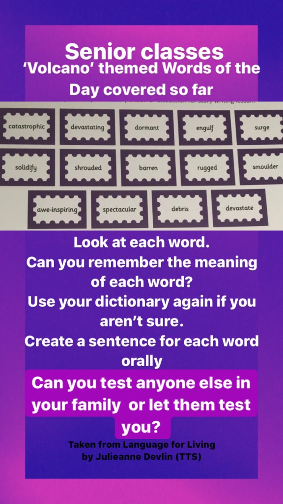 Senior classes: This week we will revise all the ‘volcano’ themed words we have covered so far. (Taken from Language for Living Box 3)