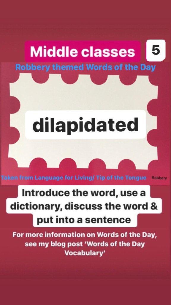Middle classes: This week we will begin ‘Robbery’ themed words of the day (Taken from Language for Living box 2) (For those in my classes who may have done these already please look at the senior words of the day now)