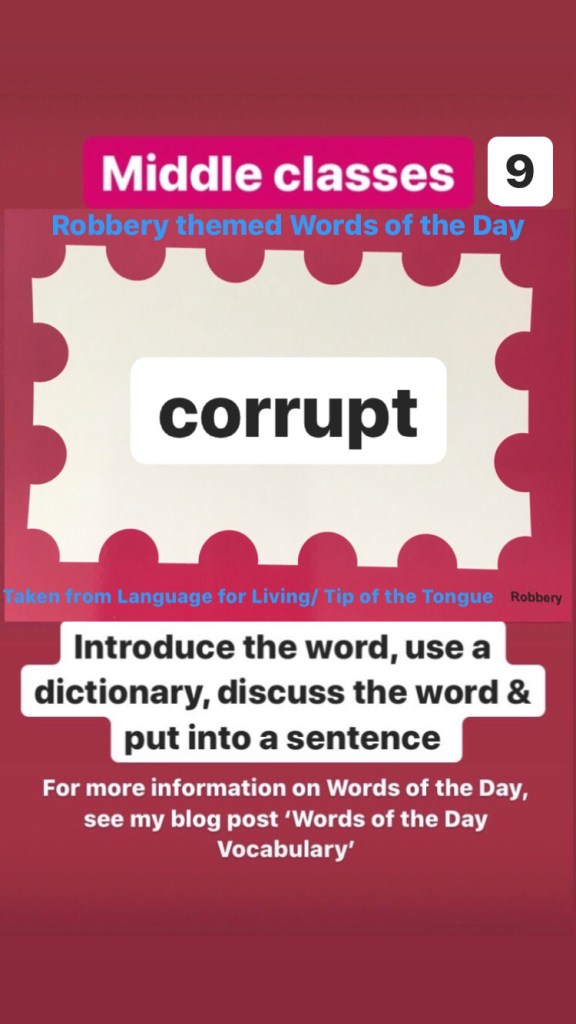 Middle classes: This week we will begin ‘Robbery’ themed words of the day (Taken from Language for Living box 2) (For those in my classes who may have done these already please look at the senior words of the day now)