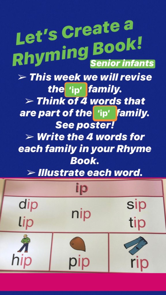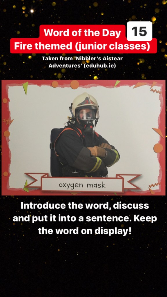 Junior classes: There will be a fire themed word each day (taken from Nibbler’s Aistear Adventures)