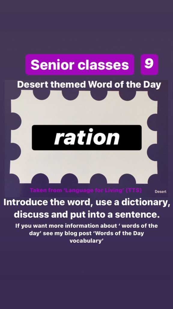 Senior classes: This week we will begin ‘desert’ themed words of the day (Taken from Language for Living Box 3)