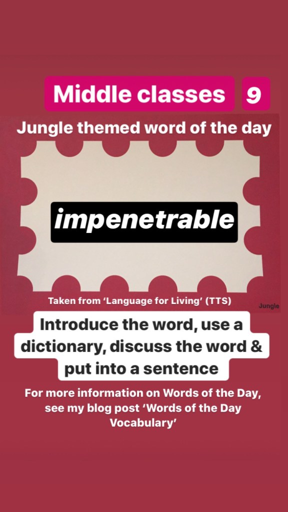 Middle classes: This week we will begin ‘jungle’ themed words of the day (Taken from Language for Living box 2) (For those in my classes who may have done these already please look at the senior words of the day now)