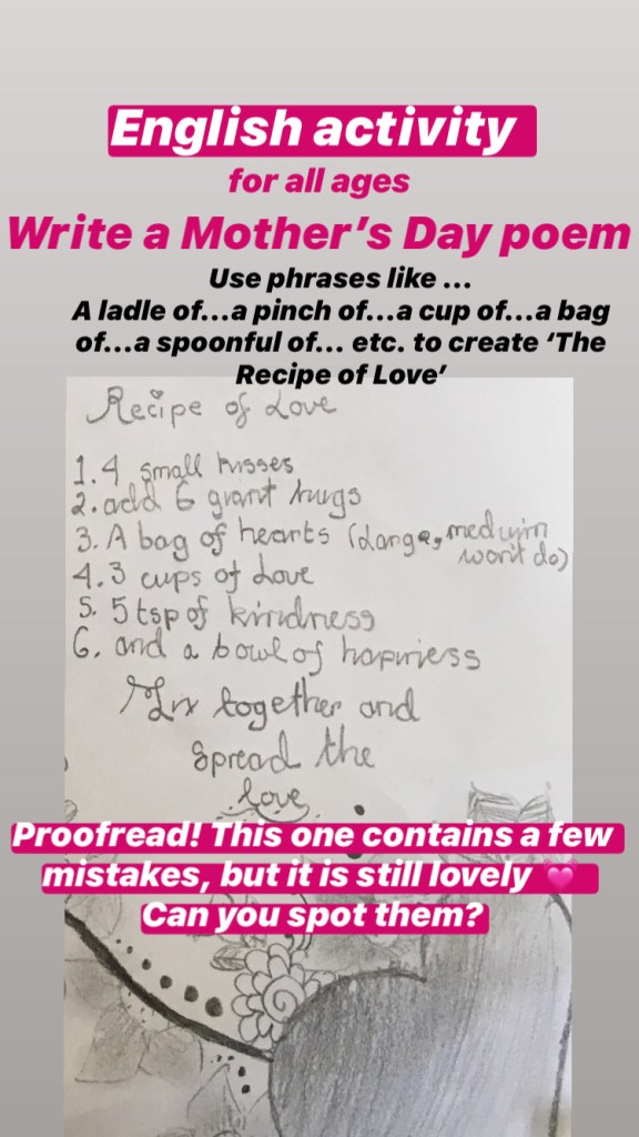 If you have any questions for me, or suggestions that you would like me to include, please contact me. My details are at the bottom of the ‘home’ page. I will do my best. More activities will be posted on Monday!