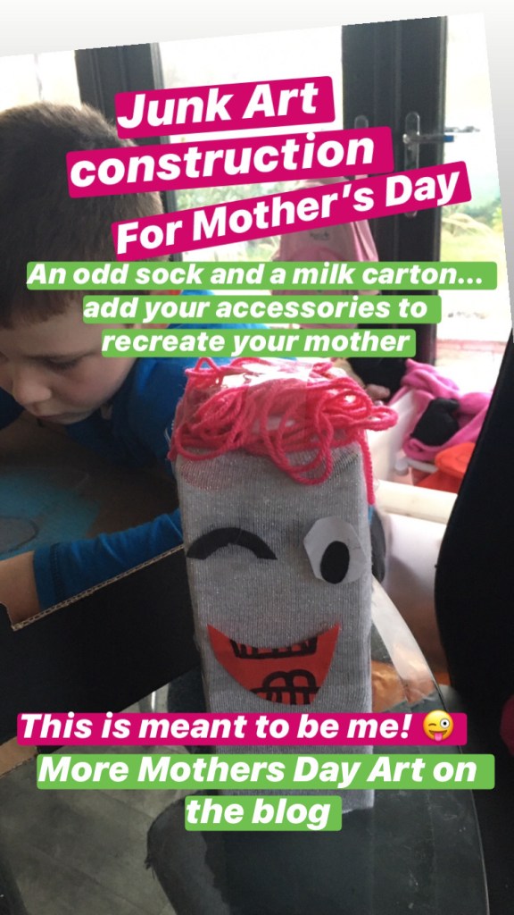 Nothing very fancy here, but encouraging children to use materials in the house that you are finished with…as in junk…odd socks, cereal boxes etc and see what they can create you for Mother’s Day!