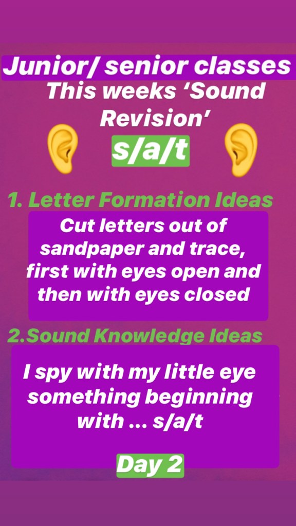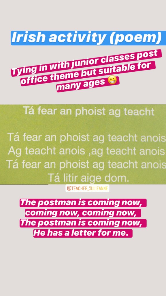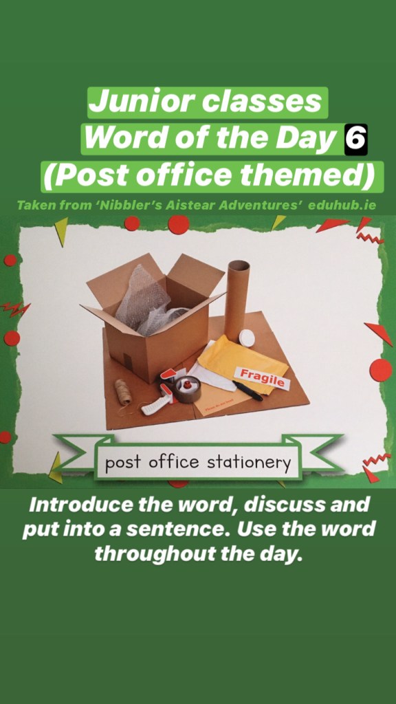 Junior classes: There will be a post office themed word each day (taken from Nibbler’s Aistear Adventures)