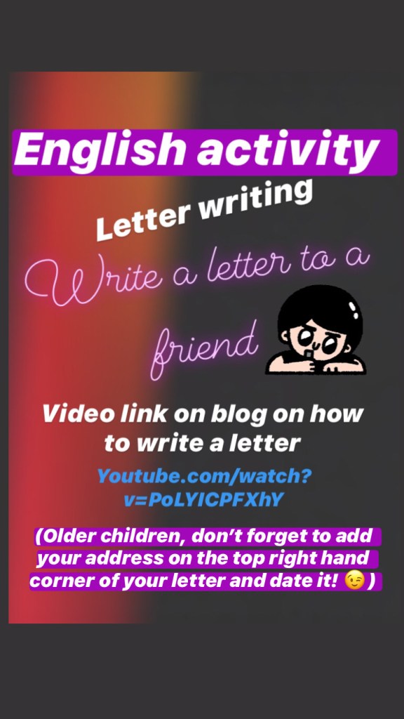 This is a difficult time so there is no pressure on parents to do any of these activities. There is enough stress added to many households as it is. These are just suggestions if you want them…but don’t forget to try and slot some reading time into your day! If you partake in the activities I would encourage you use a copy and keep everything you do each day in the one copy. Maybe you can show all your work to your teacher when you return to school!