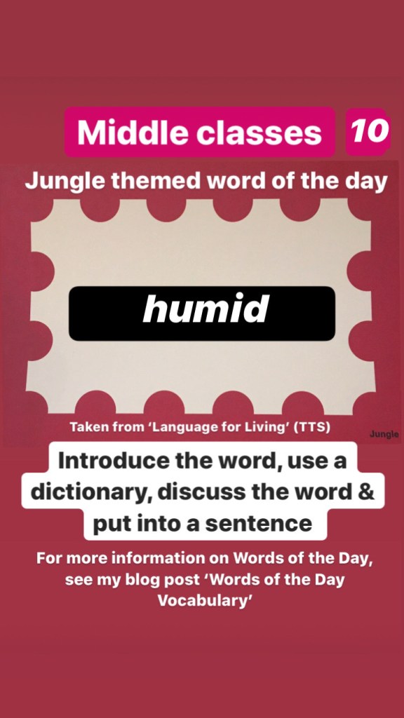 Middle classes: This week we will begin ‘jungle’ themed words of the day (Taken from Language for Living box 2) (For those in my classes who may have done these already please look at the senior words of the day now)