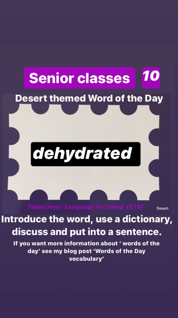 Senior classes: This week we will begin ‘desert’ themed words of the day (Taken from Language for Living Box 3)