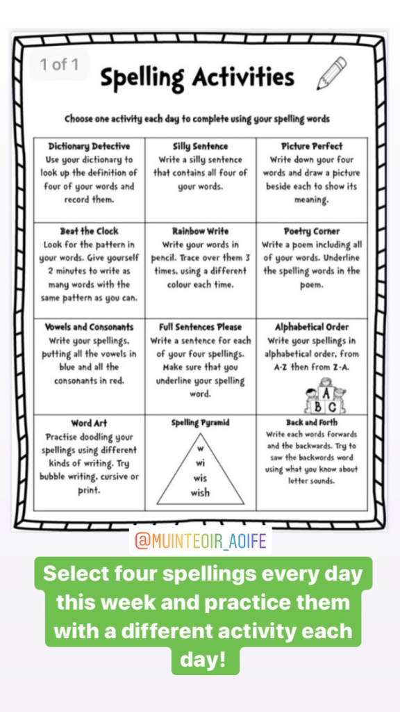 Choose one of these spelling activities for each day this week. (1st -6th classes)