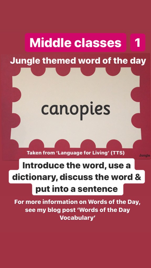Middle classes: This week we will begin ‘jungle’ themed words of the day (Taken from Language for Living box 2) (For those in my classes who may have done these already please look at the senior words of the day now)