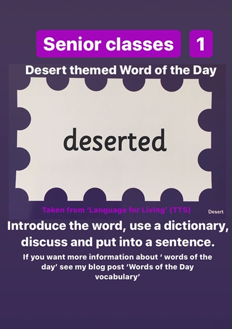 Senior classes: This week we will begin ‘desert’ themed words of the day (Taken from Language for Living Box 3)