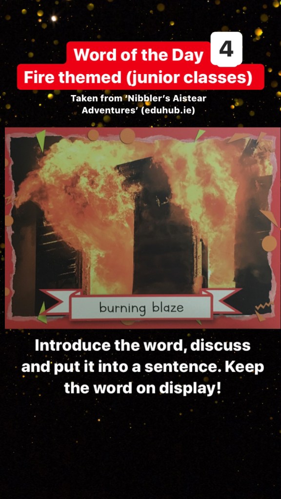 Junior classes: There will be a fire themed word each day (taken from Nibbler’s Aistear Adventures)