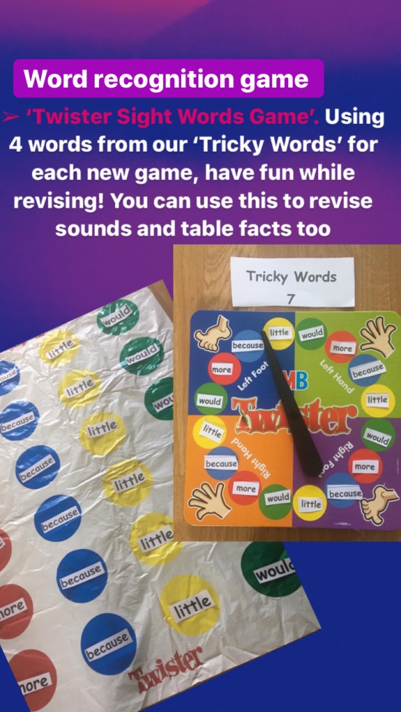 Older pupils can adapt this to sticking on their words of the day…give the defination of the word as you get into position on the Twister mat!