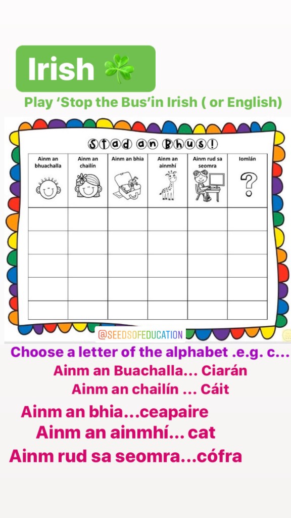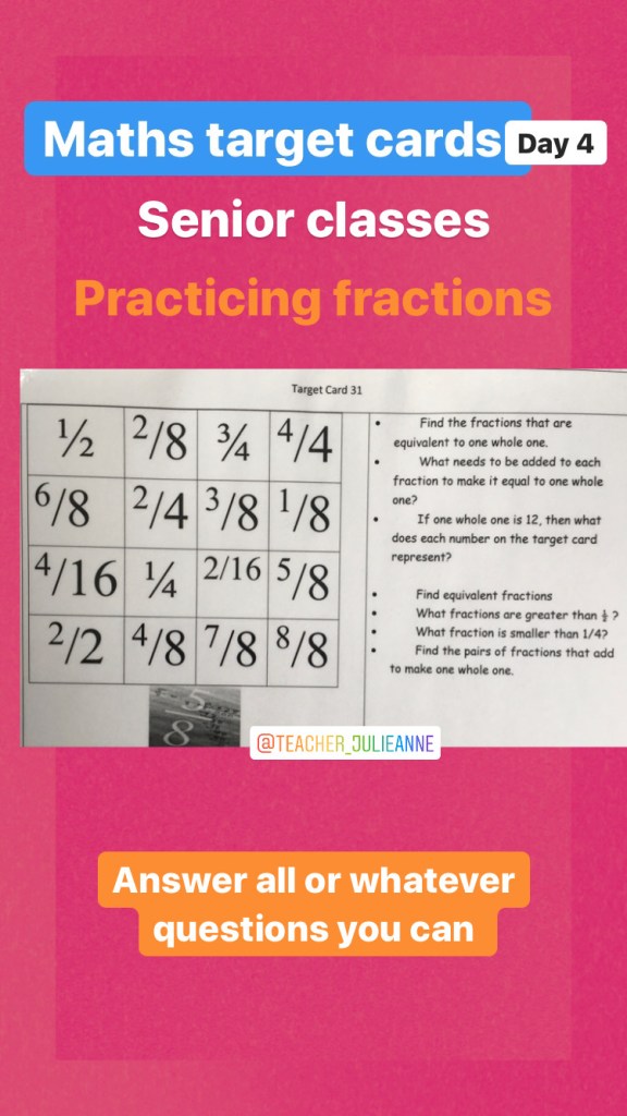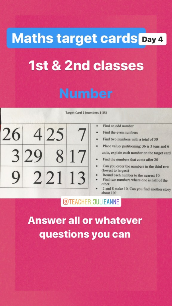 This is a difficult time so there is no pressure on parents to do any of these activities. There is enough stress added to many households as it is. These are just suggestions if you want them…and the suggested work I am putting up for our own school and my multi-grade class of 2nd, 3rd and 4th …but don’t forget to try and slot some reading time into your day! There are activities here for children from 3 years to 12, just select your own class level.