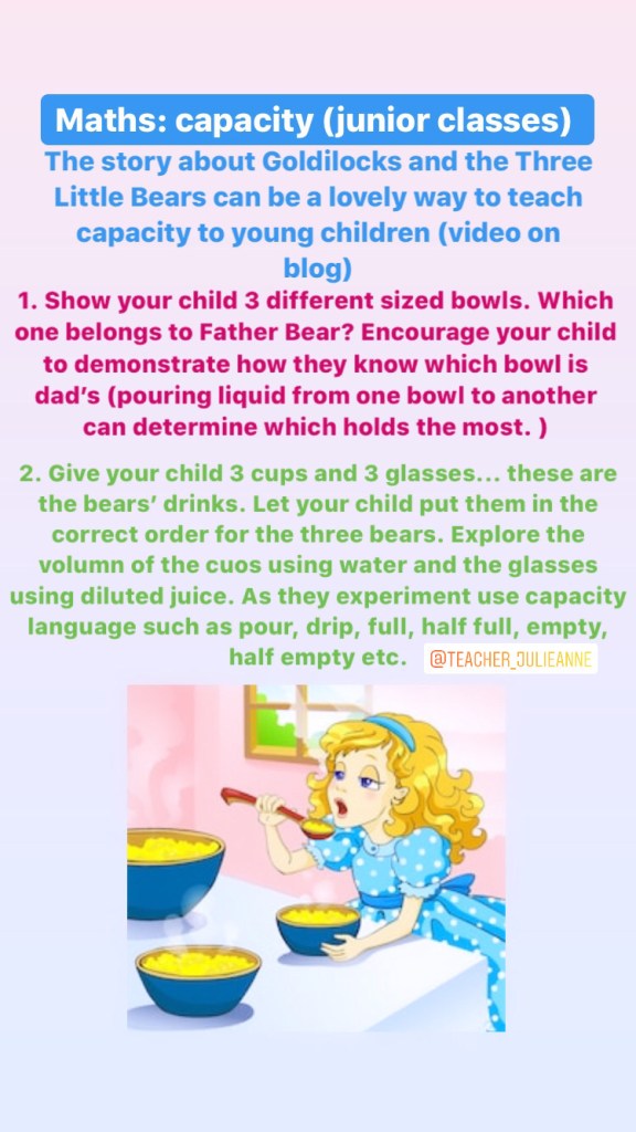 The story of Goldilocks and the Three Bears can be a lovely story to use to teach younger children about capacity. Listen to the short video of the story below before beginning your activity today.