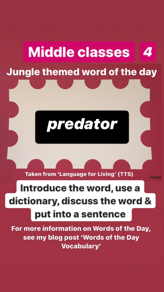 Middle classes: This week we will begin ‘jungle’ themed words of the day (Taken from Language for Living box 2) (For those in my classes who may have done these already please look at the senior words of the day now)