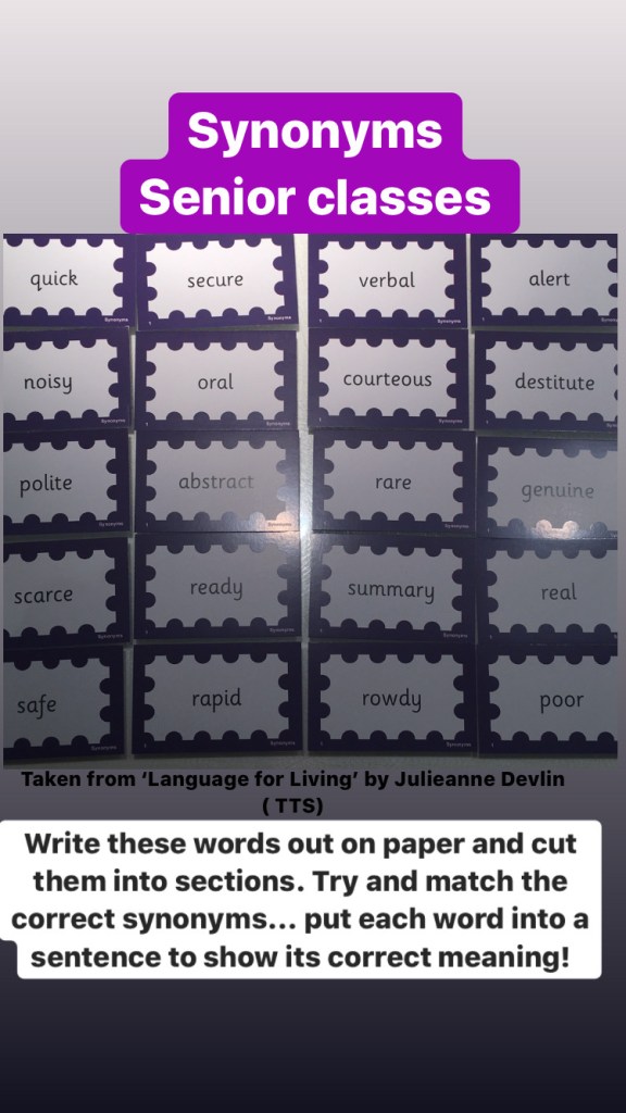 Senior classes: This week we will begin ‘desert’ themed words of the day (Taken from Language for Living Box 3)