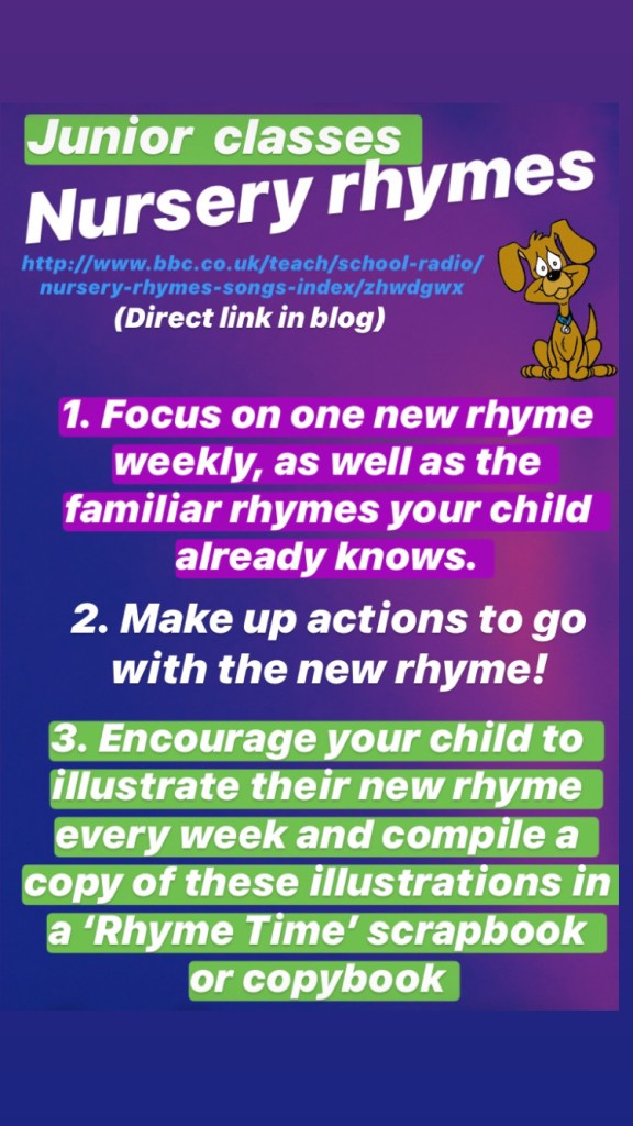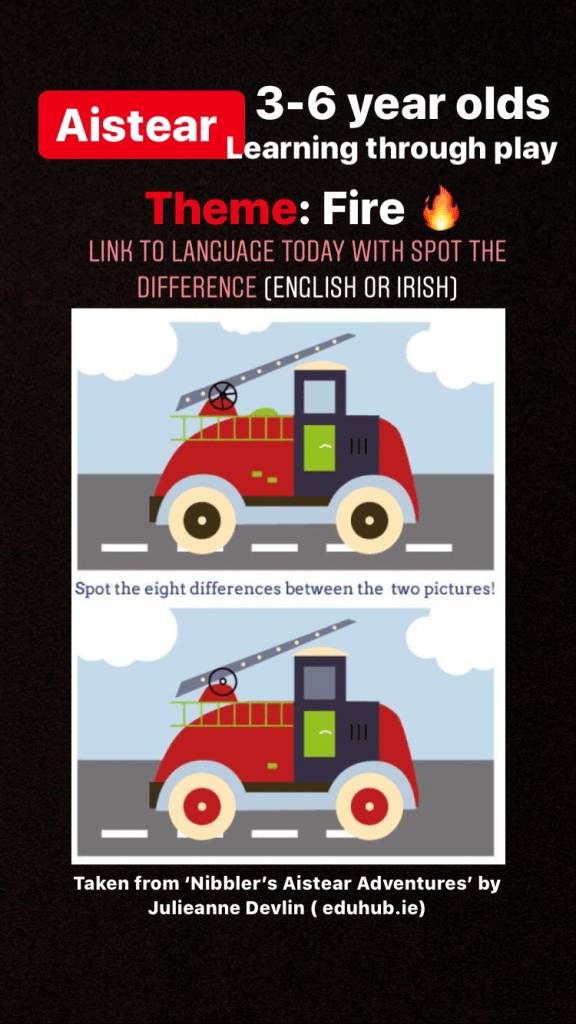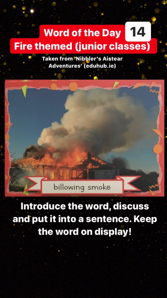 Junior classes: There will be a fire themed word each day (taken from Nibbler’s Aistear Adventures)