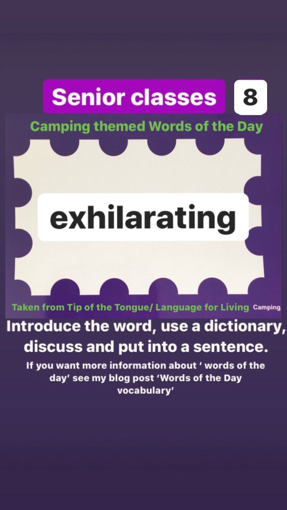 Senior classes: This week we will begin ‘camping’ themed words of the day (Taken from Language for Living Box 3)