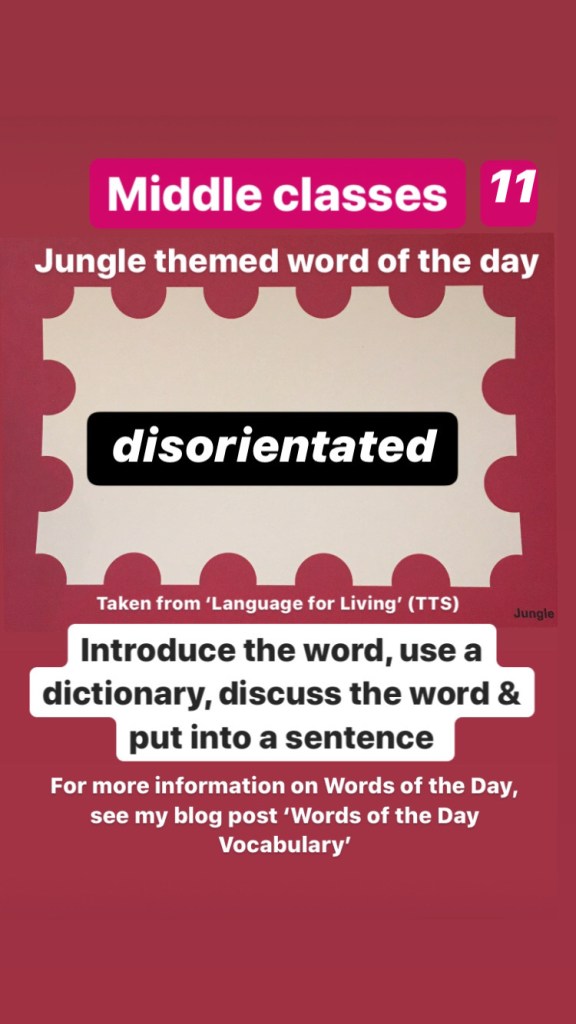 Middle classes: This week we will begin ‘jungle’ themed words of the day (Taken from Language for Living box 2) (For those in my classes who may have done these already please look at the senior words of the day now)
