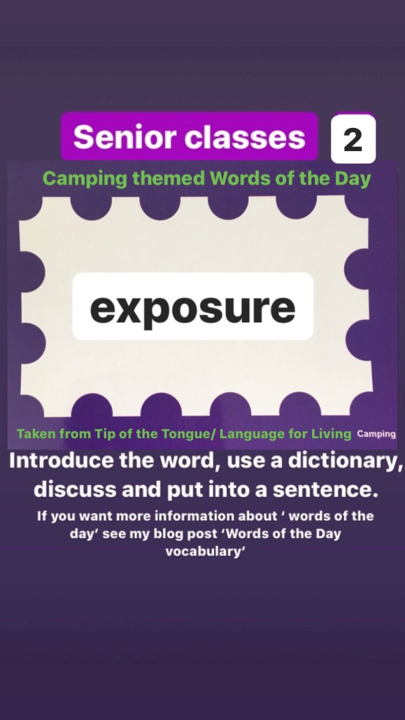 Senior classes: This week we will begin ‘camping’ themed words of the day (Taken from Language for Living Box 3)
