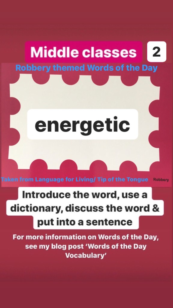 Middle classes: This week we will begin ‘Robbery’ themed words of the day (Taken from Language for Living box 2) (For those in my classes who may have done these already please look at the senior words of the day now)