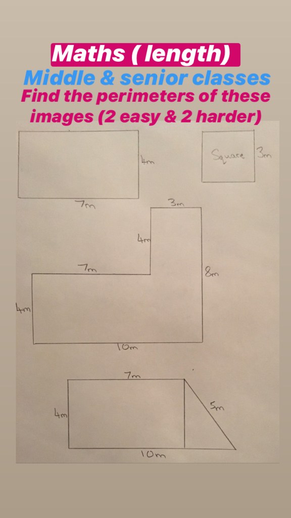Middle & senior classes find the perimeter. An example is done below for you. I have set four images for you to find the perimeter of…two easy and two hard . You can choose according to your level or try both!