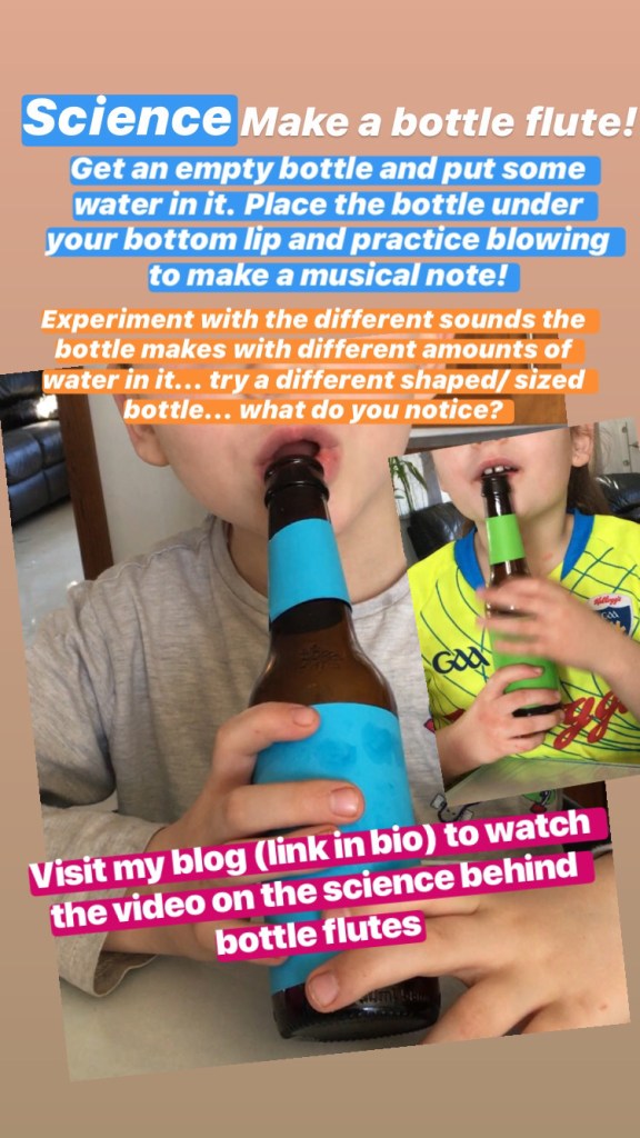 Bottle Flutes: Watch the experiment we did at home and then get your own bottle to try it out. The science behind this experiment is in an additional video below this for older children.