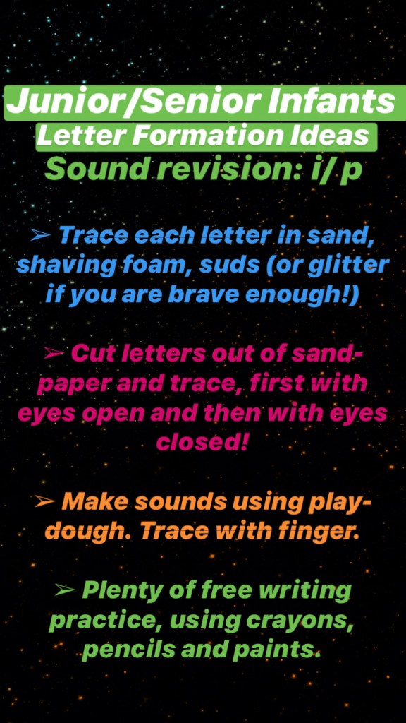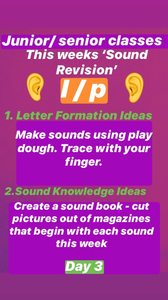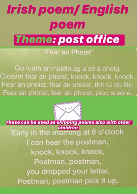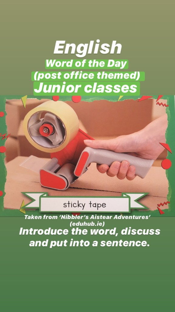 Junior classes: There will be a post office themed word each day (taken from Nibbler’s Aistear Adventures)