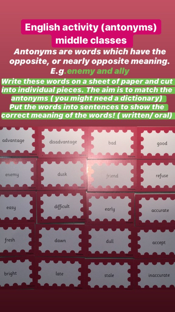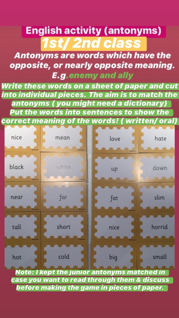 Expand your vocabulary using these antonym activities…select the image best suited to your child. Encourage pupils to use a dictionary if they are able and to create sentences orally/ written to show understanding of the words. Write out the words on paper and cut the paper into strips so it becomes a matching game.