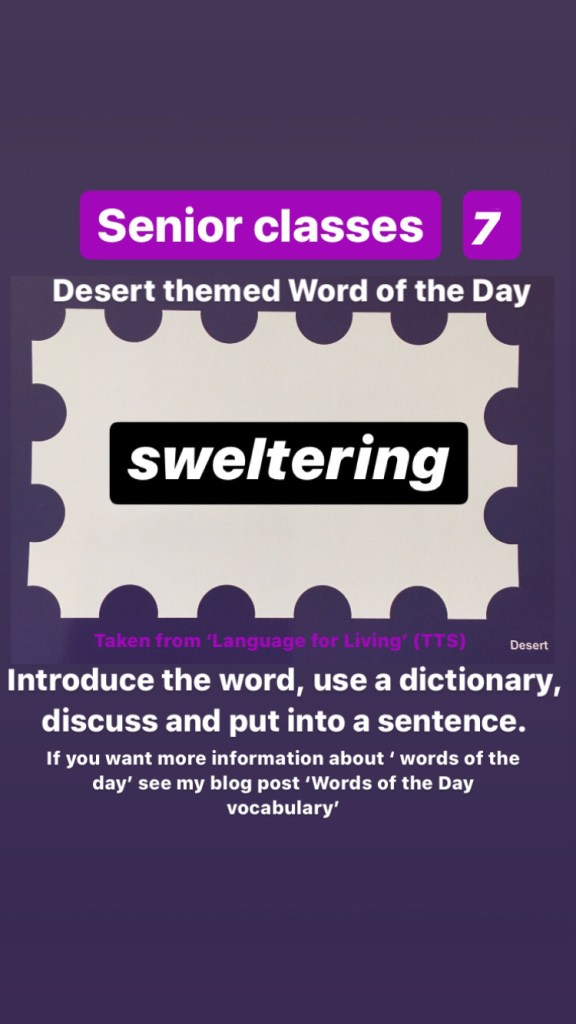 Senior classes: This week we will begin ‘desert’ themed words of the day (Taken from Language for Living Box 3)